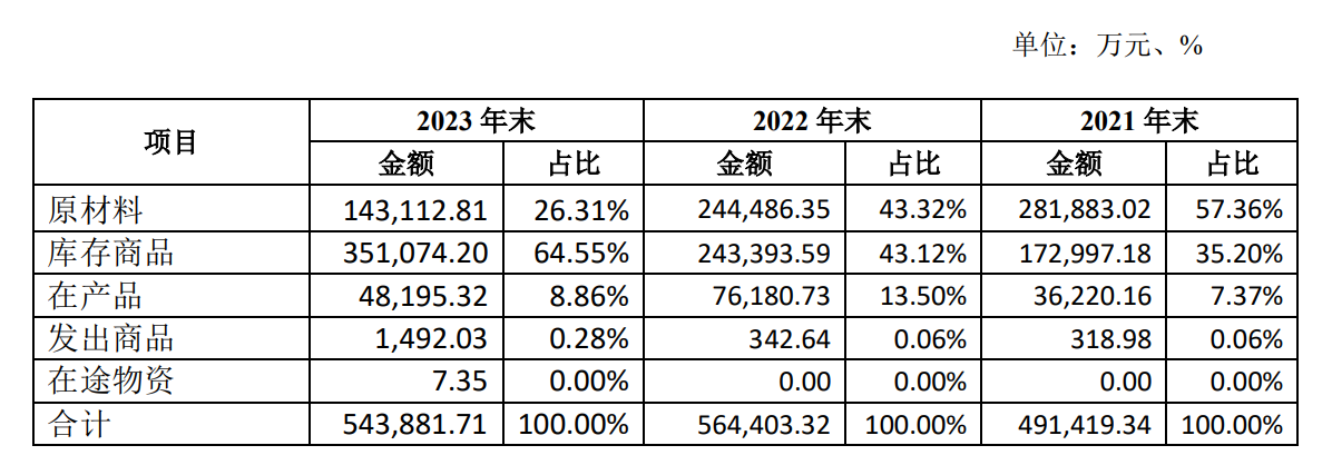 公告显示,2021年至2023年各年末,健友股份存货账面余额分别为 49.14亿元、56.44亿元、54.39亿元,存货具体明细情况如下: