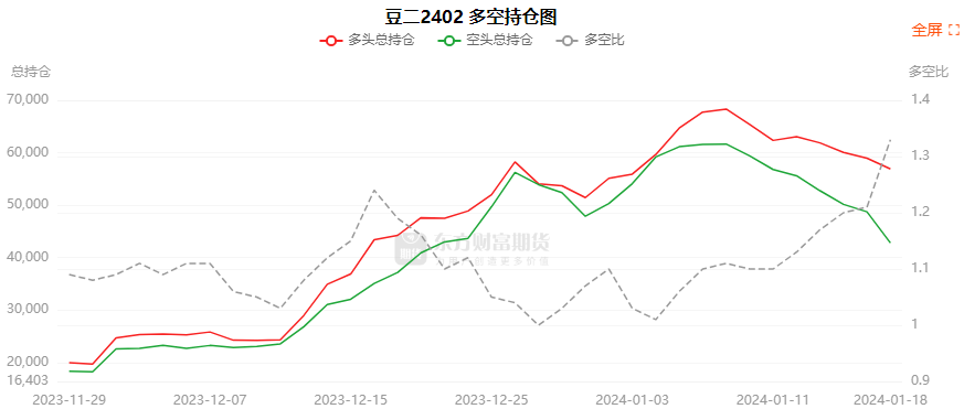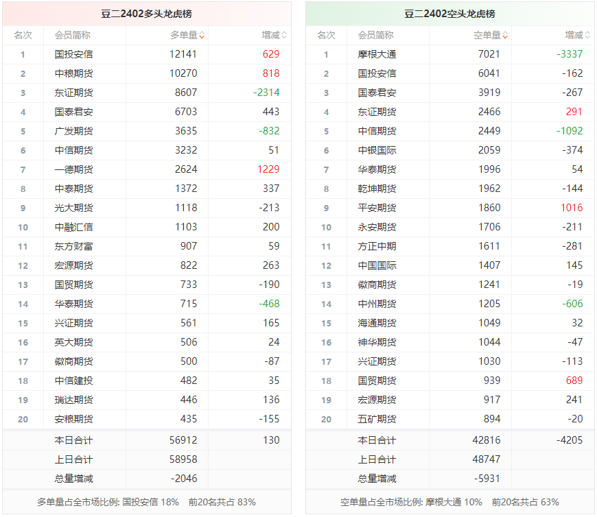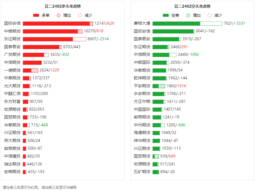 总体而言,豆二2402合约今日减仓下行,多空持仓排名前20席中,多空双方均呈退场态势,多头退场意愿弱于空头。