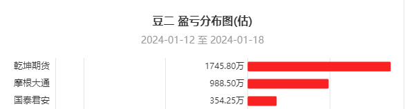 数据显示,一周内乾坤期货、摩根大通、国泰君安在豆二上盈利居前,三机构分别盈利1745.80万元,988.50万元,354.25万元。