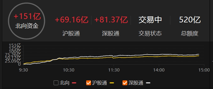 据Choice金融终端数据,截至12月28日14时52分,北向资金净流入超150亿元,达到151亿元。