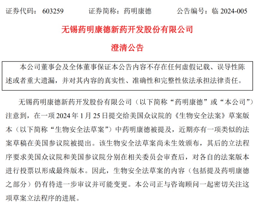 药明康德公告称,公司注意到,在一项2024年1月25日提交给美国众议院的《生物安全法案》草案版本(生物安全法草案)中药明康德被提及,近期亦有一项类似的法案草稿在美国参议院被提出。该生物安全法草案尚未生效颁布,其后的立法程序要求美国众议院和美国参议院分别在相关委员会审查后,对各自的法案版本进行投票以形成最终版本。因此,生物安全法草案的内容(包括提及药明康德之部分)仍有待进一步审议并可能变更。