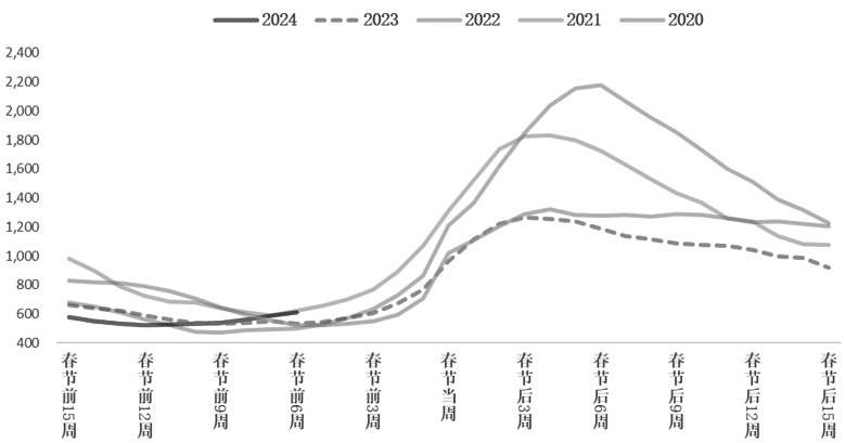 不过,低供应难以支撑钢价上行,多因淡季螺纹钢需求走弱更加明显,高频需求指标均迎来大幅下降。同口径下,螺纹钢周度表观需求量最新值为226.63万吨,2023年11月以来累计下降23.92%。相应地,水泥和混凝土出货量同期则是下降21.20%、13.84%。最新周度表观需求较去年农历同期大幅下降24.04%,可见螺纹钢需求表现疲弱,继而抑制淡季钢价。