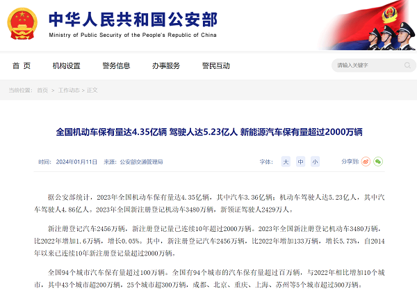 昨日,公安部发布数据显示,2023年全国机动车保有量达4.35亿辆,其中汽车3.36亿辆,新能源汽车2041万辆;机动车驾驶人达5.23亿人,其中汽车驾驶人4.86亿人,占驾驶人总数92.92%;全国新注册登记机动车3480万辆。